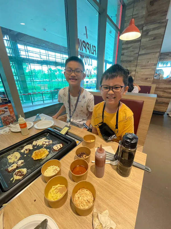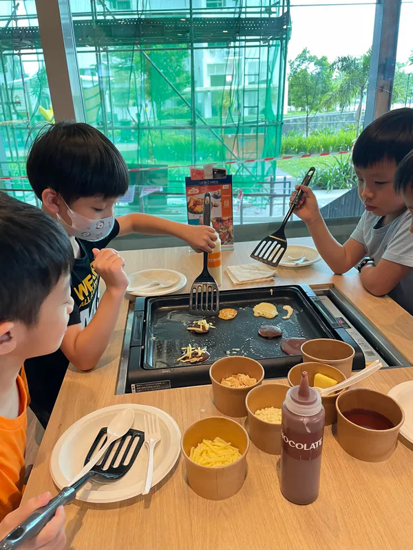 Treat your kids to a session of fluffy pancakes with a variety of tasty toppings—cheese, syrup, chocolate chips, and more!